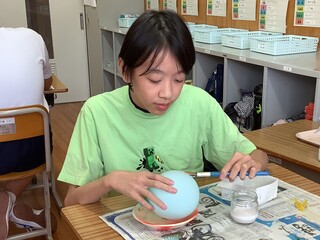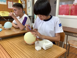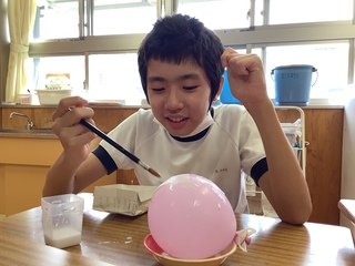 公開日 2025年10月24日 美術では、風船に半紙や新聞紙を貼り付けながら、動物をモチーフにした作品作りをしています。ベースとなる風船に、水で溶かしたボンドを使って隙間がないように一生懸命、紙を貼り付けています。「張り子」特有の、徐々に紙が重なり、厚みが出ていく様子を楽しみながら活動しています。個性溢れる動物たちの完成が楽しみです。