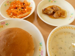 公開日 2026年01月08日 1月8日(木) 「りんごチップ入りパン、てりやきチキン、にんじんサラダ、コーンチャウダー、牛乳」 本年もどうぞよろしくお願いいたします。衛生面に気を配り、ウマい給食が提供できるよう頑張ります。