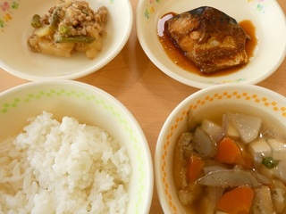 「ごはん、さばの味噌煮、じゃがいものそぼろ煮、根菜汁、牛乳」