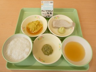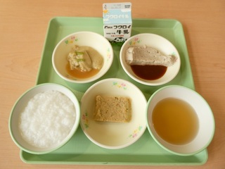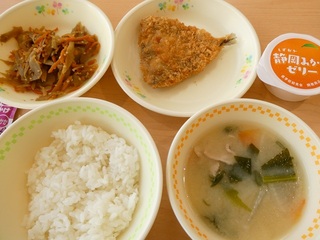 「ごはん、ふりかけ、あじフライ、きんぴらごぼう、豚汁、みかんゼリー、牛乳」