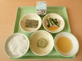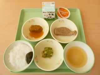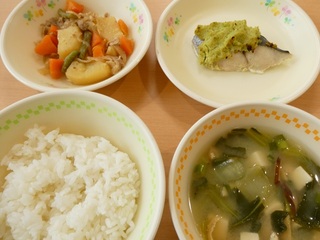 「ごはん、さわらのずんだ焼き、肉じゃが、チンゲンサイのみそ汁、牛乳」