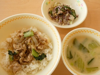 「麦ごはん、豚丼の具、ゆかり和え、ご汁、牛乳」
