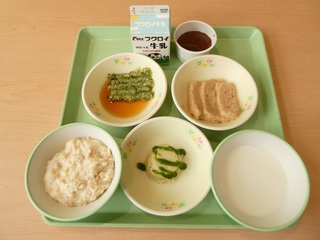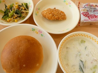 「りんごチップ入りパン、ポテトとお米のささみカツ、ぽん酢和え、チンゲンサイのミルクチャウダー、ガトーショコラ、牛乳」