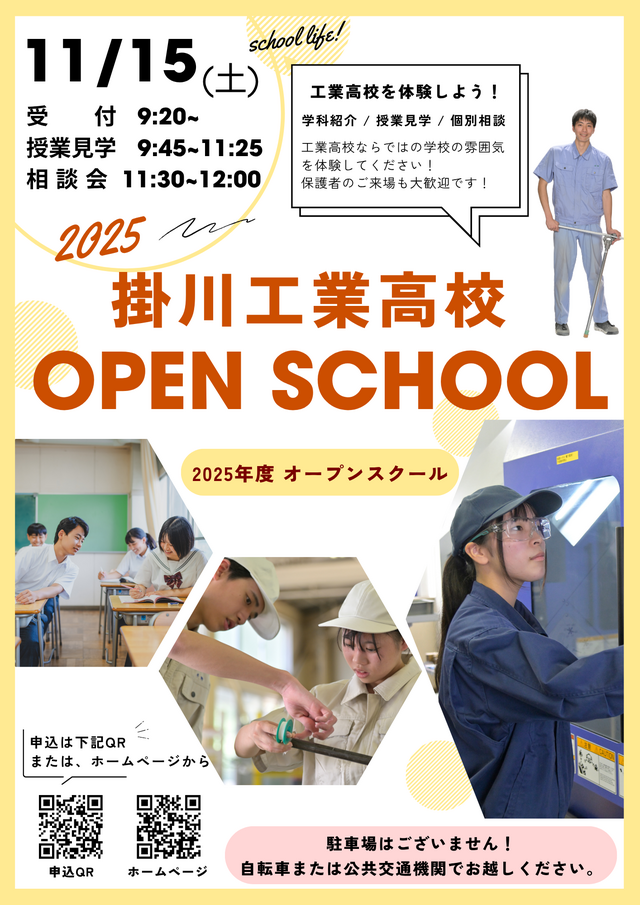 - 駐車場はありません。来校の際は、自転車🚴または公共交通機関を御利用ください。