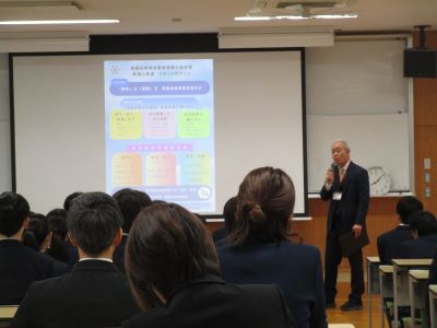 公開日 2026年04月13日 4月7日(火)に新任式及び1学期始業式を行いました。 新任式では、今年度、新たに6名の教員を迎えました。 1学期始業式の副校長の話では、目指す生徒像や働く(傍を楽にする)について説明が ありました。各学年の代表生徒の言葉では、代表生徒が今年度の決意や挑戦したことを堂 々と発表していました。 令和8年度も、多くの場面で生徒一人一人の「夢中」と「笑顔」の姿が見られること を期待しています。