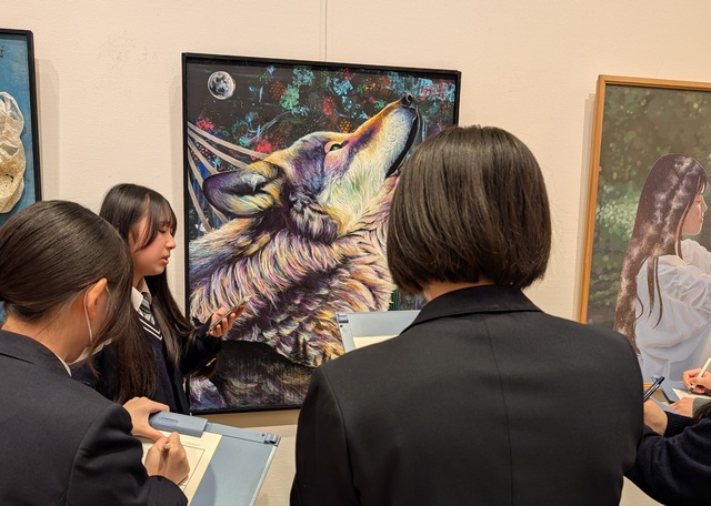また、県展に出展した生徒同士でグループを作り、作品についての交流会が行われました。お互いの作品について説明しながら、意見交換などが活発に行われました。