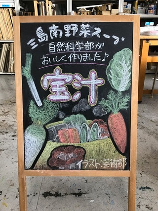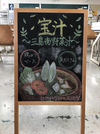 今回、「宝汁」をPRする黒板アートを芸術部で制作しました。