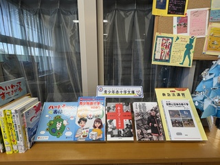 国際平和・看護・福祉・人とのつながりなどの学習に役立つ本が、64冊あります。 通常の本の貸し出しと同じように借りられます。生徒の皆さんは、ぜひ立ち寄ってください。