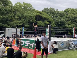 公開日 2025年07月16日 7月12日(土)に柿田川公園でおこなわれたプロレスイベントの運営を3年生の観光コースの有志がお手伝いしました。また、試合前の選手の皆さんを公園内に案内して楽しんでもらいました。