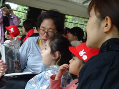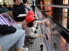 学校からサファリパークへは大型バスで行きました。現地では、とらバスに乗り換えて、動物見学に出発しました。本物の動物たちの姿に歓声を上げたり、気が付いたことをお母さんにたくさん伝えたりと、とても興奮していました。お弁当を食べた後は、モルモットやリスにえさをあげる体験もしました。みんな真剣な表情で、動物たちがえさを食べる様子を見ていました。心が動いた発見の多い1日でした。