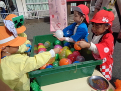 また、名物の「ちゃかちゃか音頭」では、豆絞りを器用に扱いながら、楽しく踊ることができました。本校年長のばら組の子供たちが売り子となる「お面やさん」と「ヨーヨーやさん」も、笑顔溢れる活気のあるお店屋さんとなりました。
