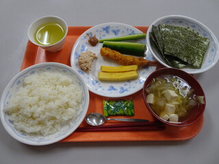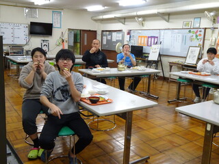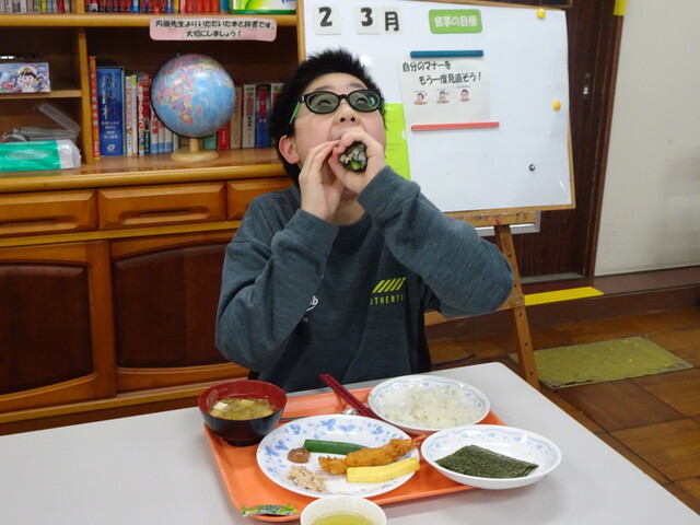 2月3日立春の日に恒例の恵方巻が夕食に出ました。今年の吉方が南南東、みんなで一斉に海苔巻きにかぶりつきました。