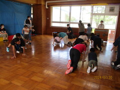 「リトミック」では、音楽に合わせて歩いたり、走ったり、かえるジャンプをしたり、お馬さんのように四つんばいになったりしました。音楽が変わるごとに、子どもたちは大興奮で身体を動かしていました。