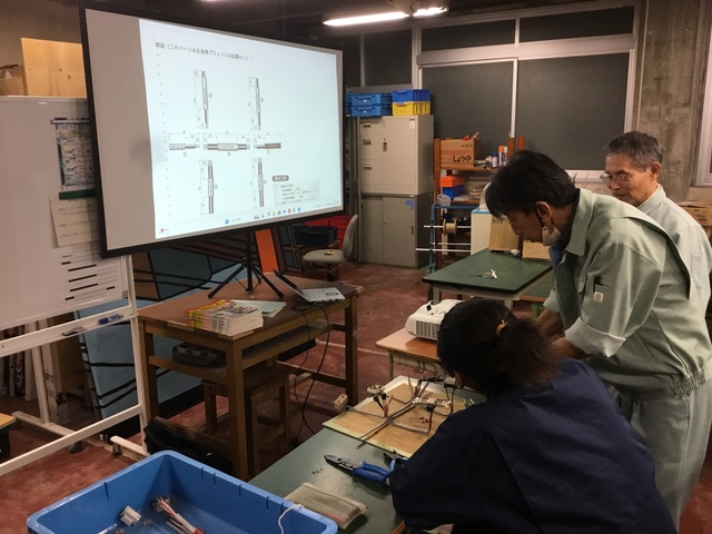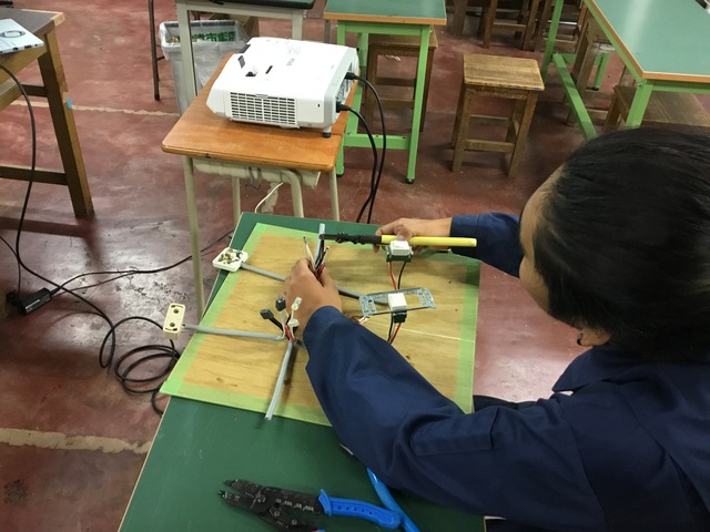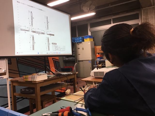 この日の実習では、電気系の実習を行っていました。内容は、電気工事に関する実習です。実際に家庭等で使われているコンセント、ブレーカー、スイッチなど電気に関する部品がどのように配線されているのかを実際に自分自身で組み合わせながら学びます。