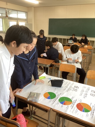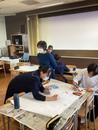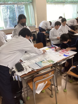 11月13日、17日に本校体育館にて、最終発表会が行われます。これまでの探究活動の成果をまとめたポスターを完成させるため、生徒たちはグループで意見を出し合いながら、最終調整を進めています。