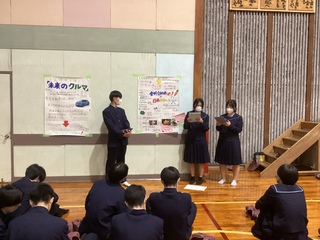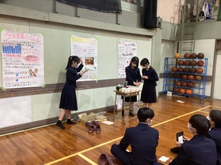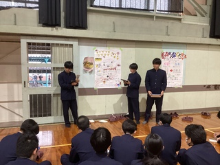 12月12日(木)、1年生が沼津活性化プロジェクトの学年発表会を実施しました。沼津の活性化を目的に、課題を設定し、調べ、分析し、思考し、協働して、その成果を発表しました。クラスの代表が各クラスをまわりながら発表しました。そのアイデアやプレゼンに多くの生徒が拍手を送っていました。