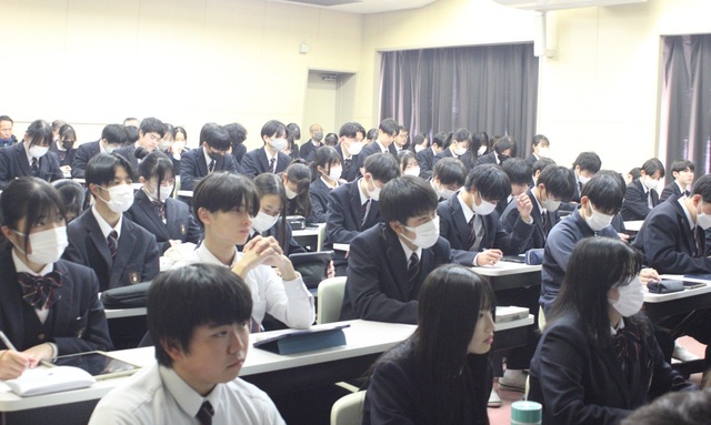 生徒は熱心に聞いており、今まで知らなかった静岡県の魅力を知る良い機会になりました。講話の後に知事へ、奨学金について、空飛ぶ車の実現はいつ頃になるか、大学卒業後に静岡県に戻った時に地域にどのように貢献すればよいかの質問がありました。「今でも暮らしやすい県であるが、より良くするために様々な施策を行っている」、「知事が静岡県の未来について語ることに説得力がある」、「静岡県に住んでいても、気づけなかったことをたくさん知ることができて良かった」などの感想が生徒から聞かれました。