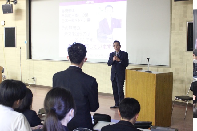 講話では、「静岡県の魅力」、「静岡県の産業」、「静岡県の主な取組み」について、話をされました。静岡県は、バランスのとれた産業構造を背景に、安定した経済基盤があり、生活しやすいなど、暮らしやすい県である。また、スタートアップ企業の支援や先端技術の導入を行い、さらなる発展を目指しているなどの、話がありました。