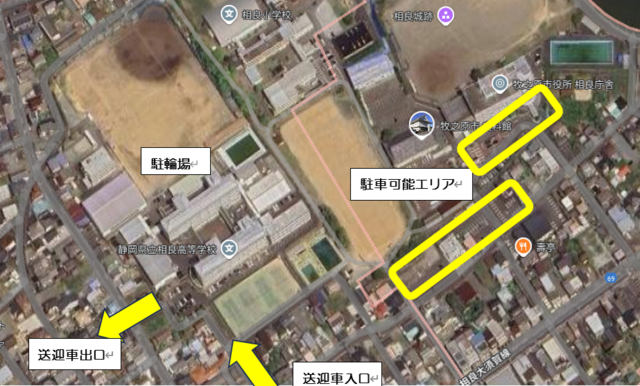 相良庁舎南側駐車場、相良小学校入口駐車場、ハイナン農協相良支店北側駐車場、