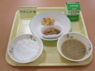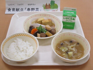公開日 2026年04月22日 【ごはん、春野菜の炊き合わせ、厚焼玉子、春キャベツとサツマイモのみそ汁、牛乳】 春が旬のたけのこやふき、春キャベツ、絹さやを使った献立でした。炊き合わせには肉団子も入り、食べやすく仕上げました。野菜たっぷりの献立でしたが、子どもたちは元気にパクパクと食べ、完食できた子も多くみられました。