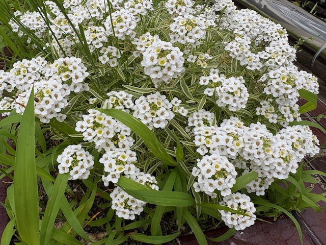 朝は曇っていますが、日中は暑くなるようですね。池の横に咲いているスイートアリッサム、長く楽しめる花です。花言葉は「飛躍」「美しさに勝る価値」「優美」だそうです。