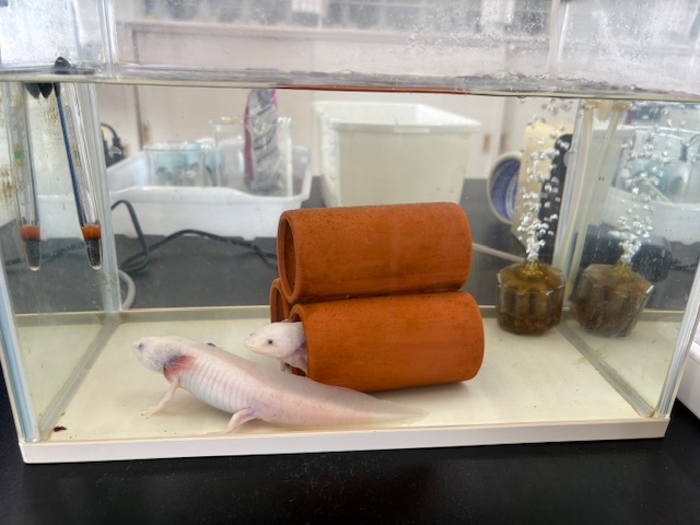 公開日 2025年07月08日 生物部では、ウーパールーパーを飼っています。文化祭の時に見た生徒もいるでしょうか。2日に1回えさをあげているそうです。性格はおっとりしていて攻撃性は低く、寿命は10~15年だそうです。今日も朝から30度近い気温で暑かったですね。