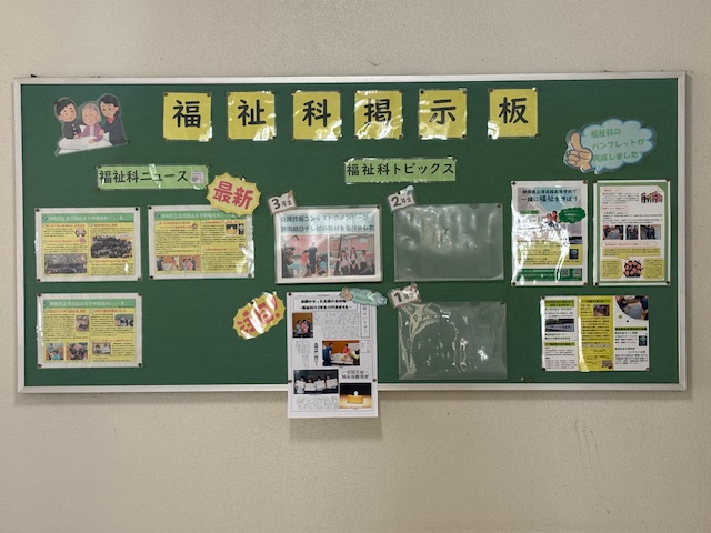 公開日 2025年09月11日 福祉科の活躍を伝える掲示板を、教室棟1階に作りました。福祉科トピックスのコーナーでは、3年生が介護技術コンテストの件で静岡朝日テレビの取材を受けている様子が伝えられています。(YouTubeで「静岡朝日テレビ東海地区高校生介護技術コンテスト東海大会」のニュースを見ることができます。)