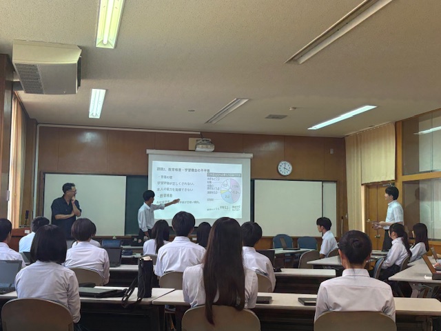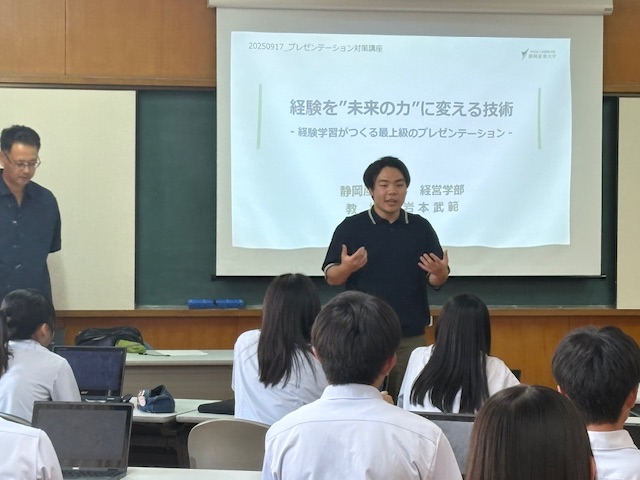 公開日 2025年09月17日 9月8日に続いて、第2回プレゼンテーション講座を行いました。2年生、3年生の希望者が集まり、静岡産業大学岩本武範教授とゼミ生3人に指導を受けました。岩本先生が設定してくださる安心安全な場で、本校生徒が、勇気を出して、自己紹介や自分が準備したプレゼンテーションに挑戦しました。学生さんが的確なフィードバックをくださり、とても勉強になりました!参加者の皆さん、一歩一歩成長していますよ。