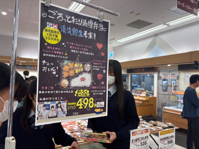 公開日 2025年10月11日 誰かの困りごとに対してアクションを起こす、探究学習「スマイルプロジェクト」の取組で、一人暮らしの若者の食生活に着目し、食べてうれしいお弁当を、2年生3人のグループが考案しました。なんと!田子重登呂田店様の御協力により、商品として販売していただくことができました。ありがとうございました!生徒たちは、当日の販売対応も含めて、いろいろな視点から感じるものがあったようです。インスタグラムの写真もぜひごらんください!