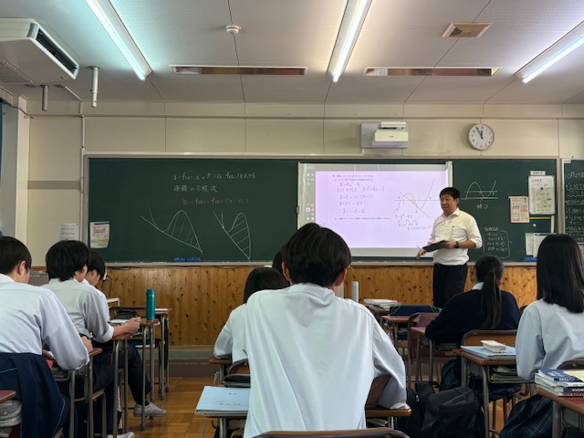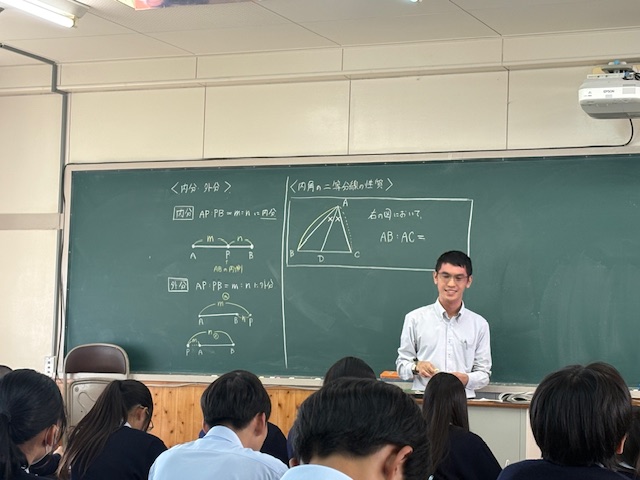 公開日 2025年10月27日 2年生普通科理系「図形の性質」 内角の二等分線の性質を証明するときに、既習事項を利用できるよう、平行な直線に着目すればよいことに気づきました。補助線の引き方のアイディアを出し合いました。 2年生普通科理系「積分法」 微分と積分の関係に着目し、積分の考え方を用いて直線や関数のグラフで囲まれた図形の面積を求める方法について考えました。