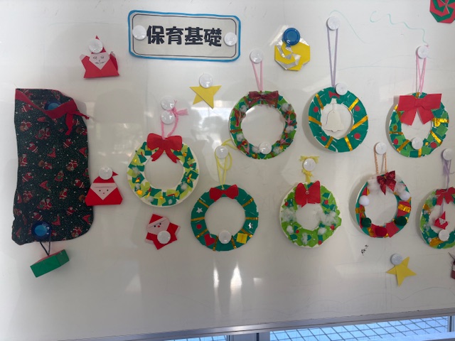 保育基礎という選択科目で、クリスマスの飾りを作りました。子どもたちが季節を楽しみ、感受性豊かに育っていくようにという意図を持っての教育活動です。