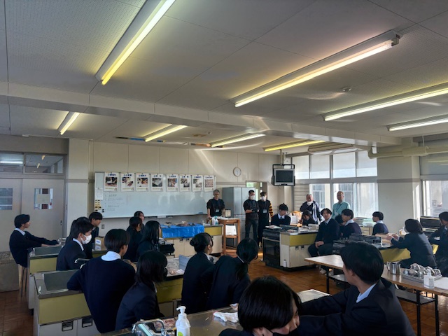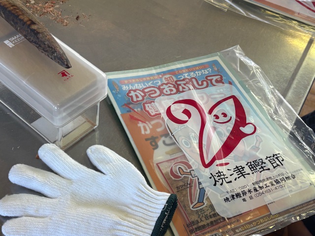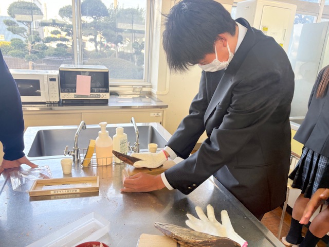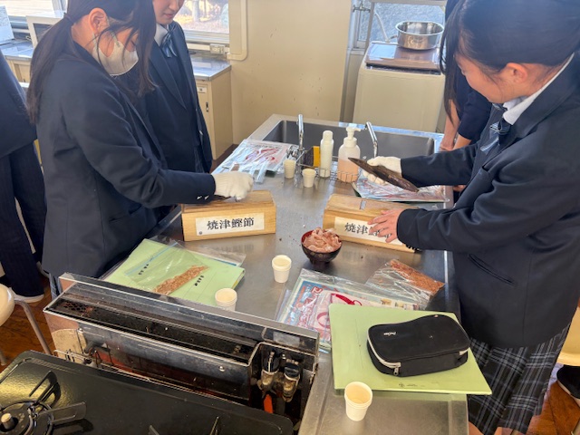 公開日 2026年01月20日 1年生の家庭基礎の授業です。焼津鰹節水産加工業協同組合の方々をお招きし、5クラス全部で、出前授業をしていただきました。ありがとうございます。お疲れさまでした。鰹節の削り体験やだしの飲み比べなどを行い、この地域の誇りとする産業と食文化について改めて意識する時間となりました。削り節の一番おいしい食べ方は、ご飯にのっけて醤油をかけて食べる、いわゆるネコまんま、とのことでしたよ!
