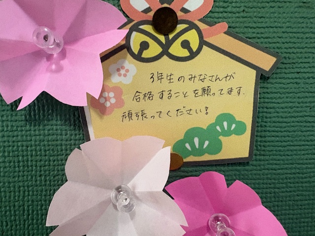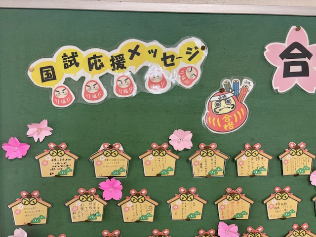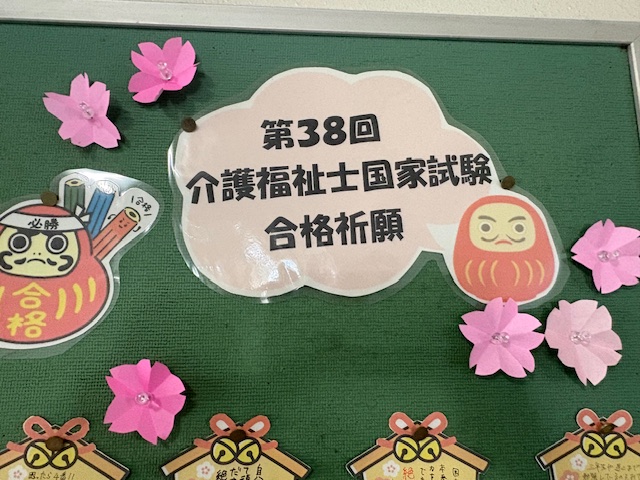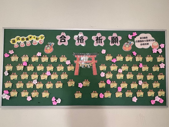 公開日 2026年01月22日 今週末25日(日)に介護福祉士国家試験が行われ、福祉科3年生が受験します。学校の福祉科コーナーには、3年生の合格を応援するメッセージが寄せられています。ぜひ1つ1つを読んでくださいね。これまで勉強して身に付けてきた力を発揮して、全員が合格してくれることを祈っていますよ。