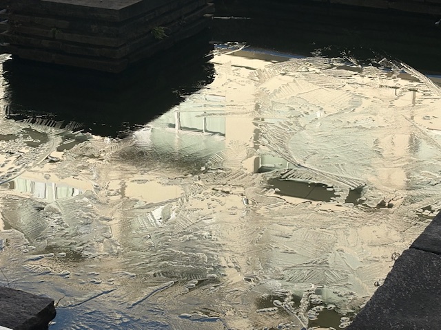 今朝の気温はマイナス1度、生徒昇降口の横の池にも氷がはっています。