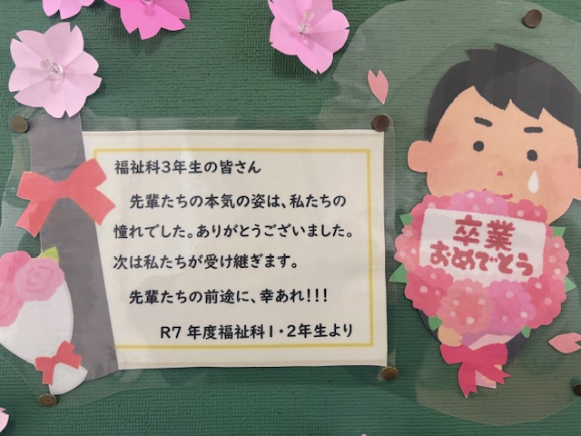 公開日 2026年03月02日 南棟の福祉科コーナーに、卒業する3年生への1・2年生からのメッセージが掲示されています。介護福祉士国家資格試験の合格を目標に、専門科目や実習、試験勉強に一生けん命に取組んだ先輩の姿を、後輩はちゃんと見ていました。全員がいい結果を手にすることができるよう、祈っていますよ。