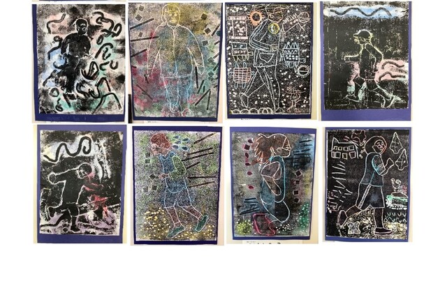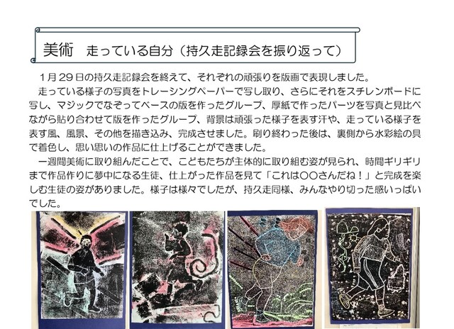 中学部1年 美術 版画「走っている自分」(持久走記録会を振り返って)