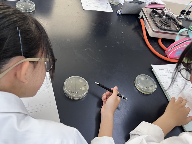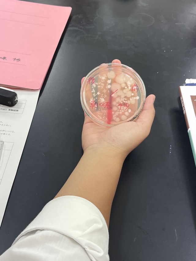 公開日 2025年05月19日 令和7年5月13日(火)・16日(金)2年選択A科目「食品微生物」にて、手指に付着している細菌を調べました。 平板培地に手洗い前と後の手を押し付け、3日間培養し、細菌の観察をしました。 手洗い前後で菌の様子が異なり、手洗いすることの大切さを感じました。また、人によって実験結果が異なり、興味深かったです。
