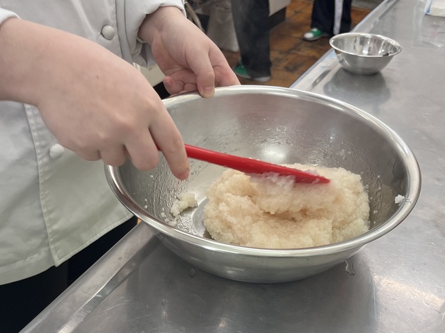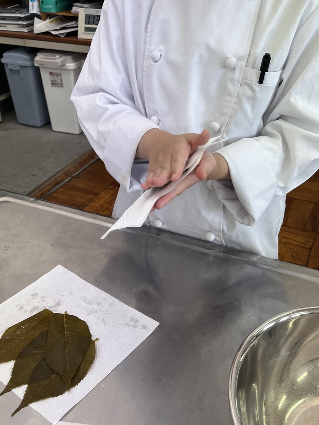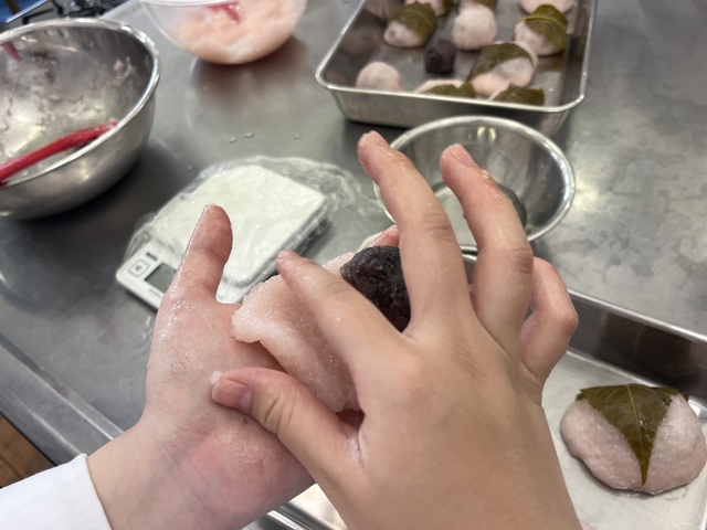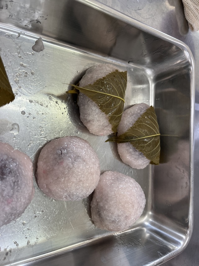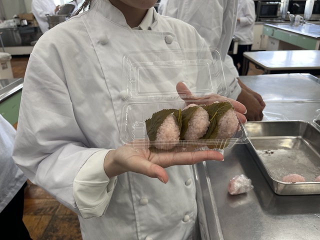 公開日 2025年05月19日 令和7年5月14日(水)3年選択A科目「食品製造」にて、桜餅の製造を行いました。 道明寺粉を蒸して桜色に着色し、前回授業で炊いたあんこで包み、最後桜葉をまき完成しました。 桜葉のしょっぱさと自分たちで炊いたあんこの甘さの対比がとても美味しかったです。
