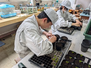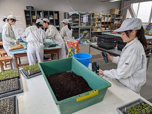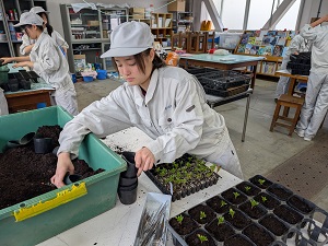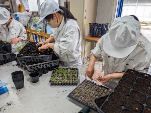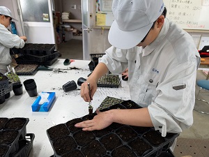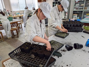 公開日 2025年05月19日 令和7年5月14日㈬ 科目「総合実習」にて、環境科学科2年デザイン系列の生徒が草花苗の鉢上げを行いました。 環境棟東側の花壇や、動物を放牧する園庭の花壇に定植する大事な花苗です。 根鉢を崩さないように、植える深さなど注意しながら約800苗の鉢上げができました。