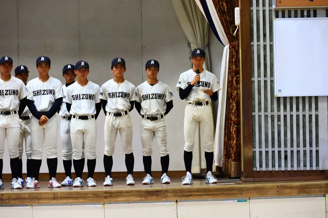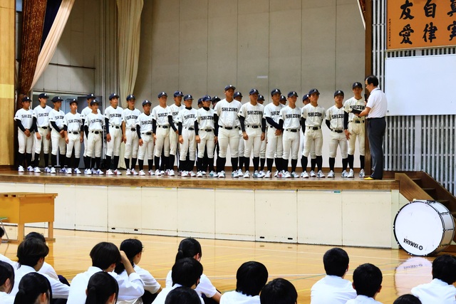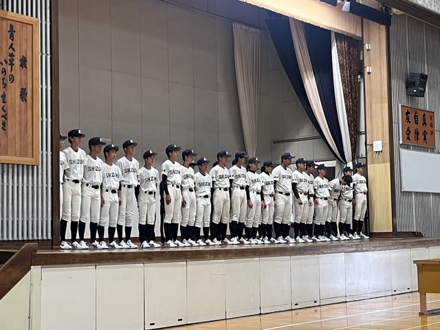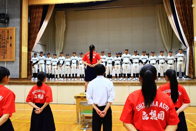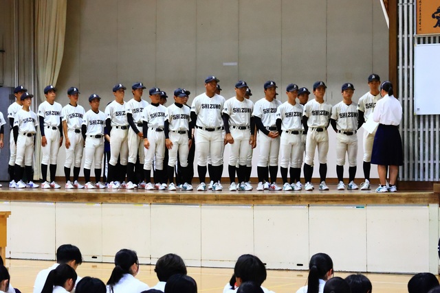 公開日 2025年06月24日 令和7年6月23日(月)放課後 本校体育館にて野球部が第107回全国高校野球選手権静岡大会に出場するということで壮行会が行われました。 初戦は榛原高校と7月6日(日)9:00~草薙球場にて行われます。 壮行会では、校長先生、生徒会長からの激励の言葉と、応援委員を主体とした全校生徒の応援がありました。 大会では日頃の練習の成果を十分に発揮し、最高の活躍を期待しています!!