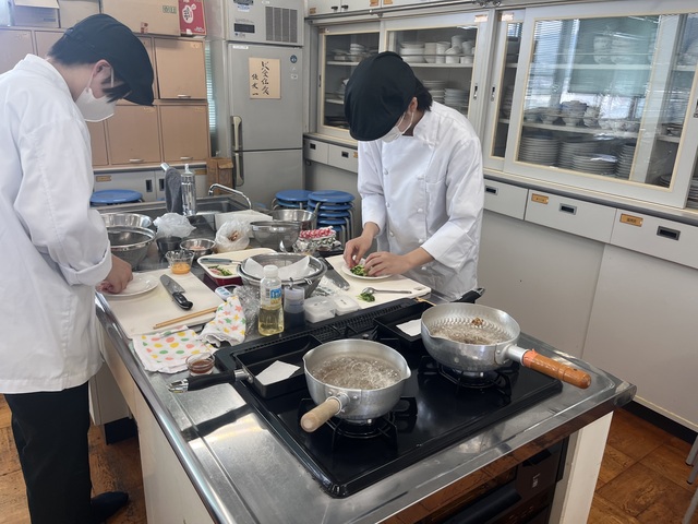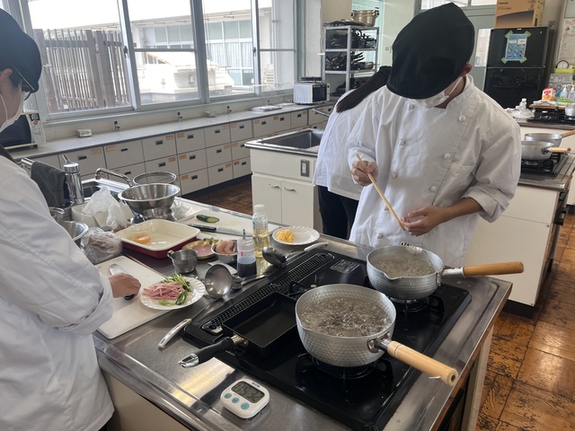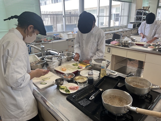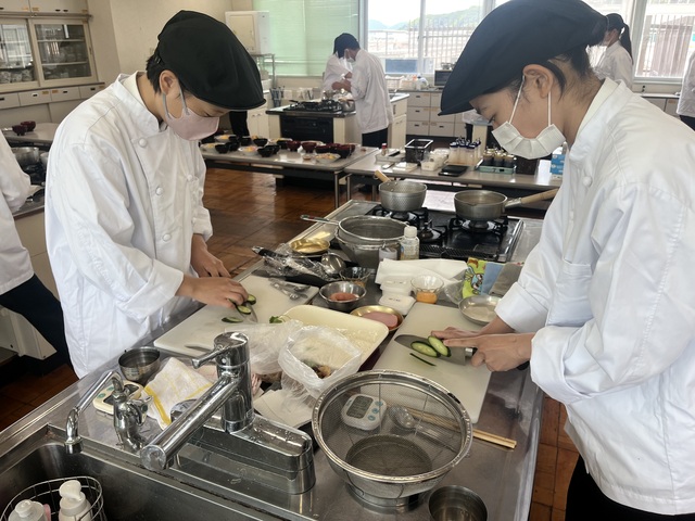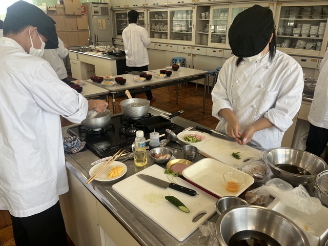 公開日 2025年06月27日 令和7年6月26日(木)本校家庭科室にて家庭科食物調理技術検定の2級の試験が行われました。 検定のメニューは「涼拌絲(リャンバンスー)」、「吉野どりの吸い物」です。 制限時間40分という短い間に、料理を完成させます! 5月の上旬に食物調理技術検定3級に合格した生徒たちですが、とても緊張しつつ、試験に挑みました。 ドキドキ、ハラハラする場面もありましたが、無事検定を終えることができました!! 全員合格できますように……。