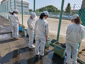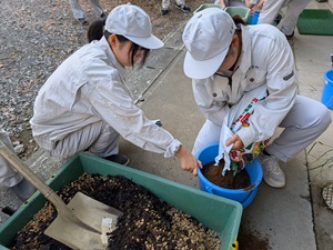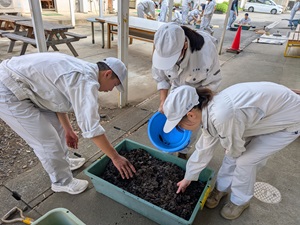 公開日 2025年09月16日 令和7年9月10日㈭ 科目「総合実習」にて、環境科学科2年デザイン系列の生徒がダイコンの播種を行いました。コンテナ栽培の種類や特徴を学び、大型コンテナを使用して培養土の配合をしたのち、収穫後の加工までの工程を生徒自ら、栽培計画を立て播種を行いました。