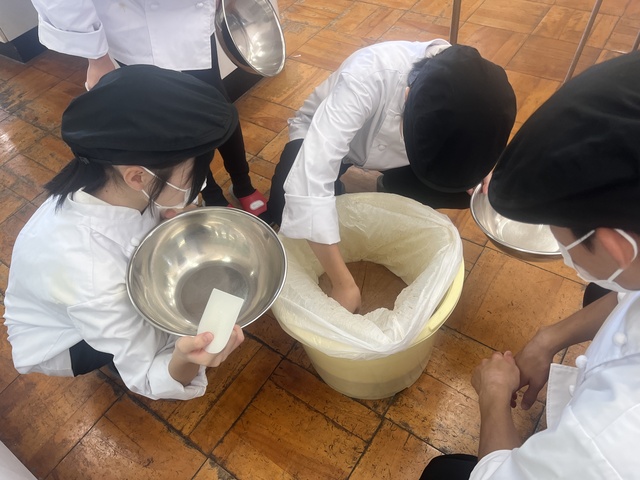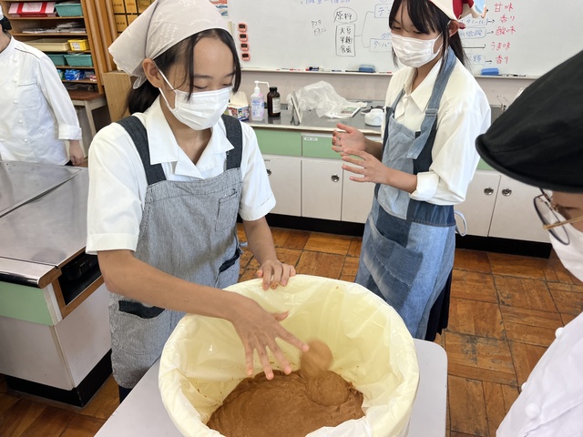 令和7年9月2日(火)2年選択科目「食品微生物」にて、味噌の切り返しを行いました。この味噌は 今年の6月上旬に仕込んだもので、約3ヶ月間発酵熟成していました。
