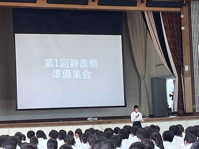 その後、静農祭の準備集会が行われました。今年の静農祭は11月14日に校内発表、11月15日に一般公開が行われます。静農祭の準備集会として生徒会メンバーから全校生徒に静農祭の準備、当日に注意すべきことが伝えられました。