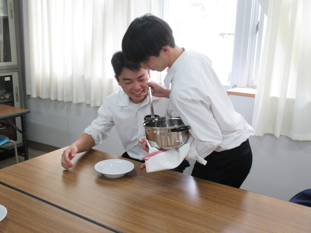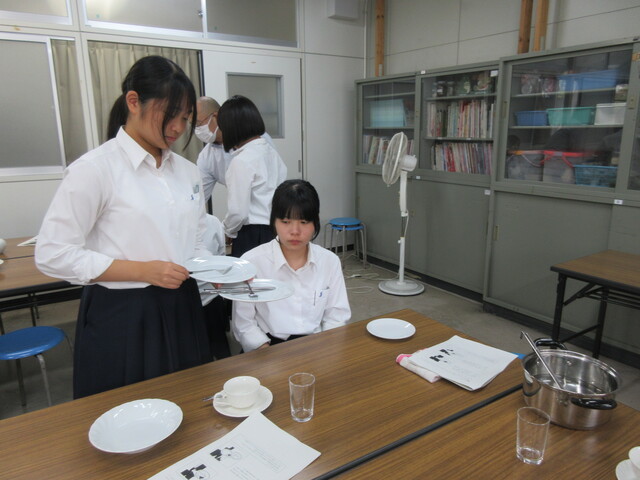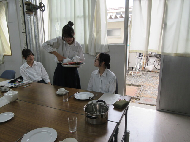 公開日 2025年10月08日 令和7年9月26日(金)・10月3日(金)5・6時間目 科目「食品サービス」にて生活科学科3年食品サービス系列の生徒が文化祭に向けてサービスの仕方について練習しています。 食器の並べ方やお皿の持ち方、スープのサービングなどを実践しながら学んでいます。まだまだ不慣れですが、文化祭では喫茶店をやるので、自信をもってお客様にサービスできるように練習を重ねていきます。