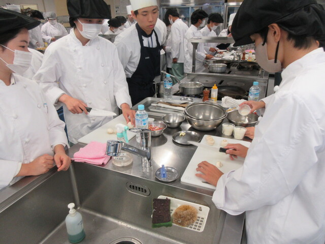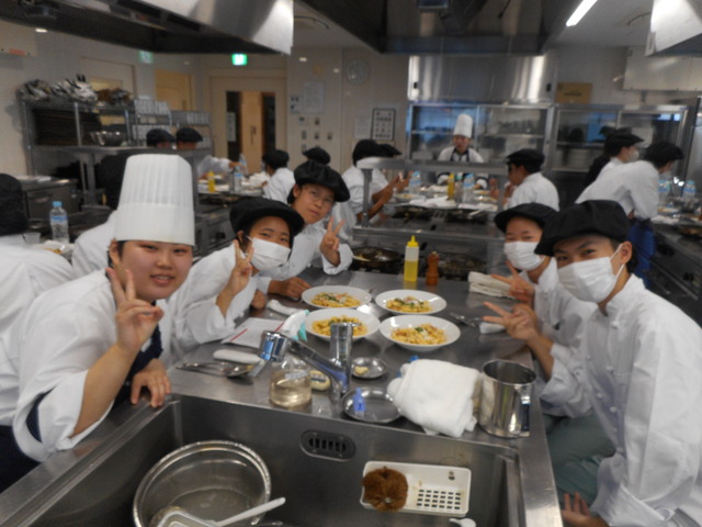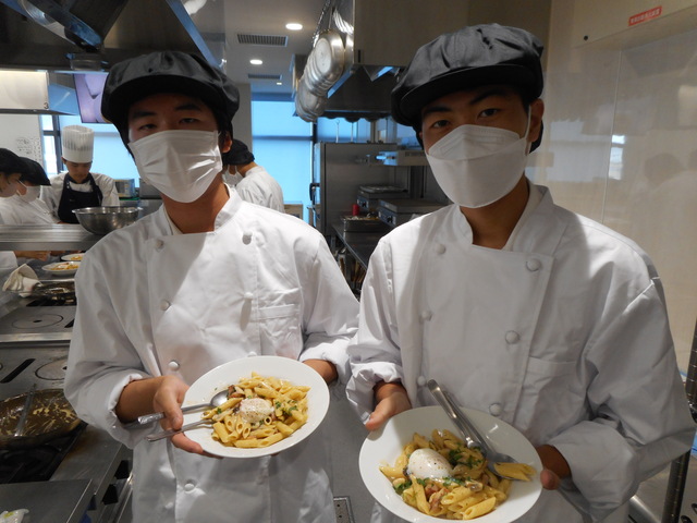 中央調理専門学校では、「ペンネカルボナーラの温泉卵添え」を専門学校生指導の下、作りました。家庭では使わない大きなコンロやフライパンが出てきて、とても緊張しましたが専門学校生のサポートもあり、無事美味しいカルボナーラを完成させることができました。