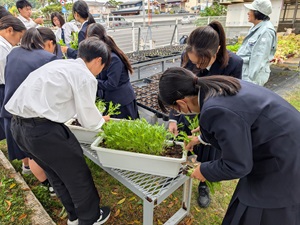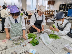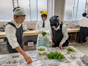 公開日 2025年10月28日 令和7年10月24日㈮ 科目「生物活用」にて環境科学科2年デザイン系列の生徒が、自分たちでコンテナ栽培した水菜の収穫・活用についてまなぶためサラダ作りを行いました。 自ら播種した水菜がすくすくと成長し、機能性などを学び、素材の味を確認するためシンプルな調理方法でおいしくいただくことができました。