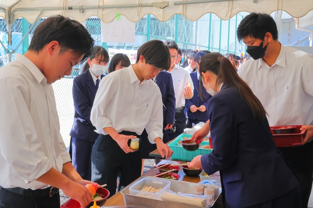 また、科目「課題研究」の中で『高校生対抗レシピコンテスト「美味しいキッチン選手権」』で準優勝となった食育班が開発した「鯵の五彩和ビンバ」が100食限定で販売されました。ほかにも、後発酵茶班は静岡茶や茶草場農法の広報のため、自分たちで作った後発酵茶の試飲会を行いました。