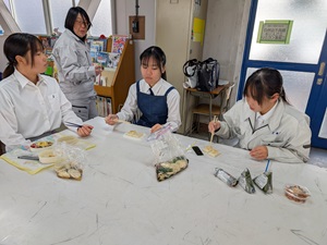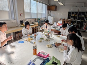 公開日 2025年12月25日 令和7年12月12日㈮ 科目「生物空間デザイン」にて、栽培していたダイコンの加工実習を行いました。 プランター栽培を学ぶために、大型プランターで9月からダイコンを栽培し、今日待ちに待った収穫でした。浸透圧を学ぶために漬物を作り、各々でメニューを考えて作った漬物をみんなで食べ、ダイコンの味や食感を楽しむことができました。