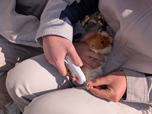 令和8年2月18日㈬ 科目「総合実習」にて環境科学科2年デザイン系列の生徒が飼育管理している小動物の爪切りや健康調査を行いました。